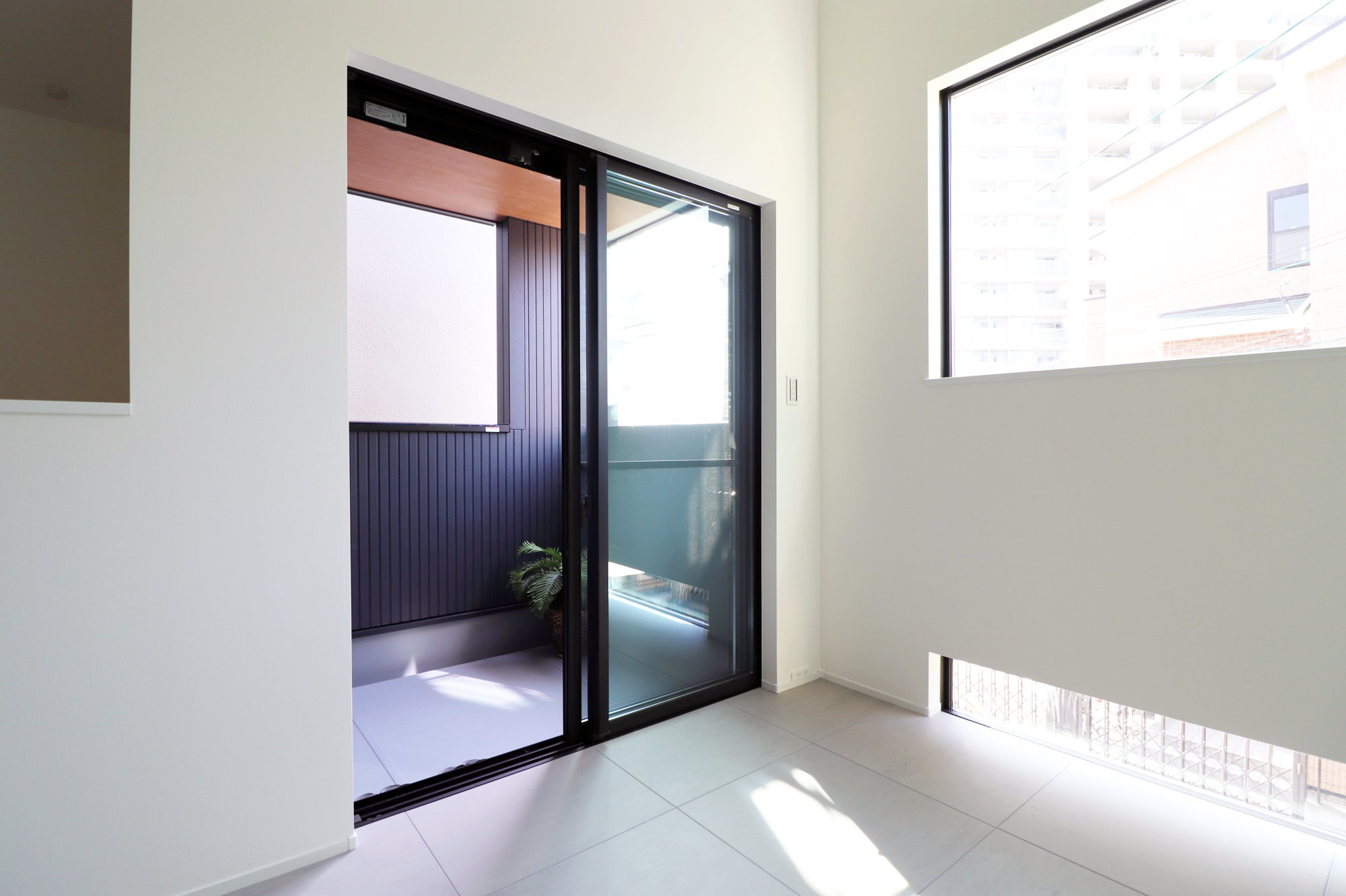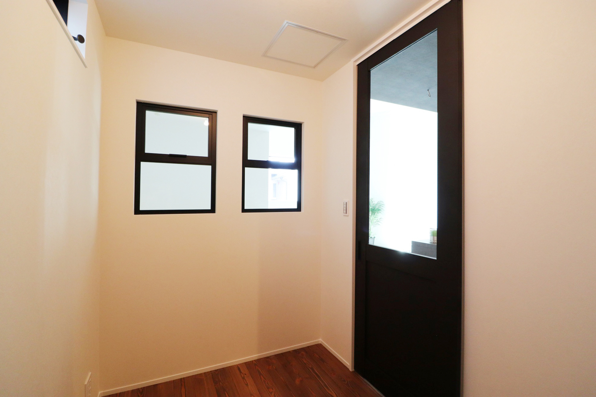 そして「一緒に暮らすワンちゃんたちも家族。お家で快適に過ごして欲しい」というテーマを元に、チワワとボストンテリアの2匹の小型犬のワンちゃん達も楽しく暮らせる用に、玄関とリビングに小型犬の低い目線に合わせ床付けの地窓を計画。