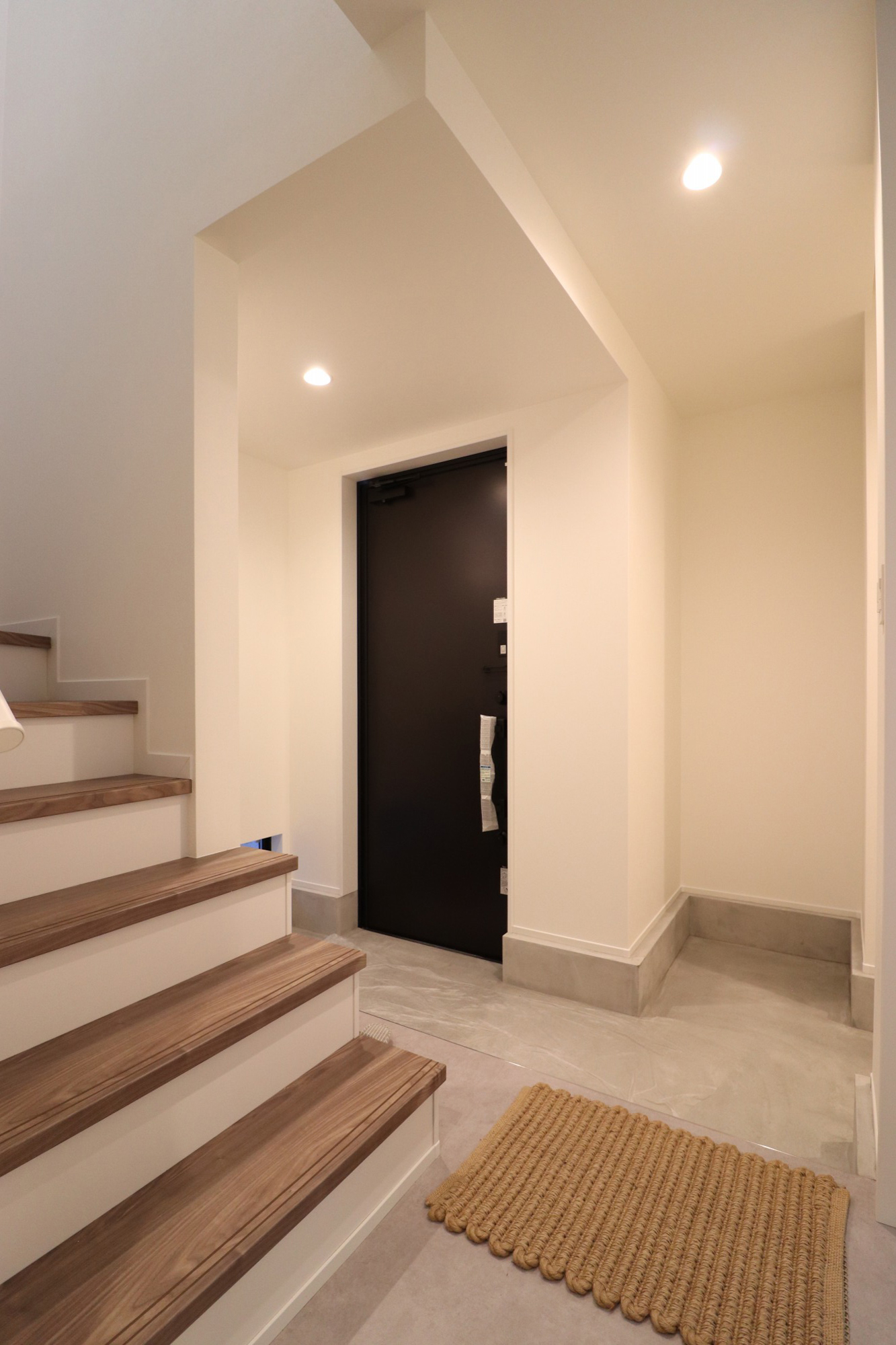 まずは玄関スペース。限られたスペースの中でも玄関を開放的に見せるように正面に位置する階段の壁を無くし、出来る限り視覚的に広がりを感じられるように工夫しました。