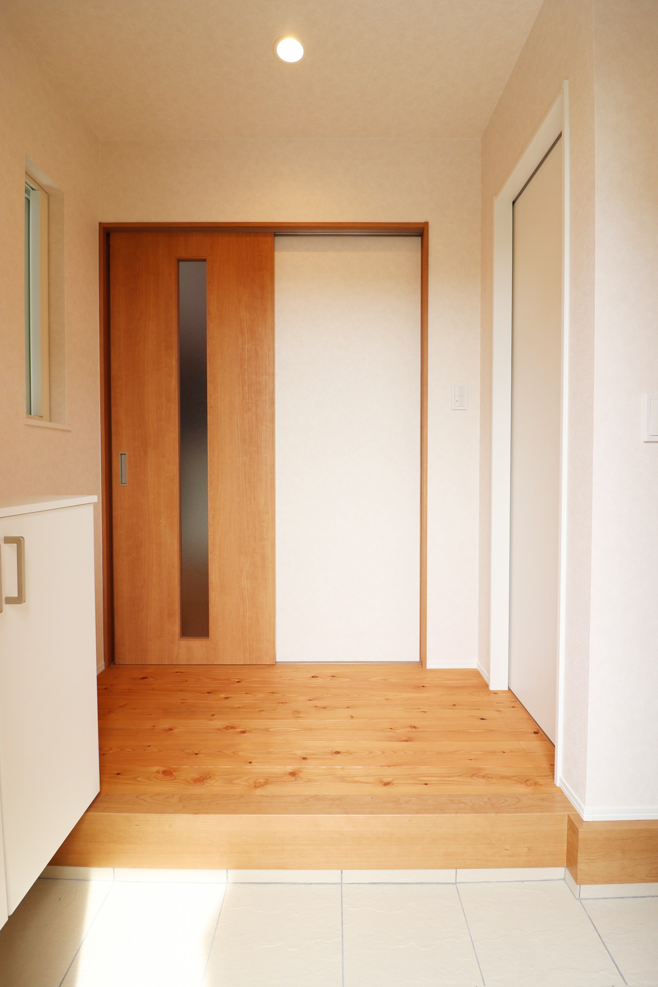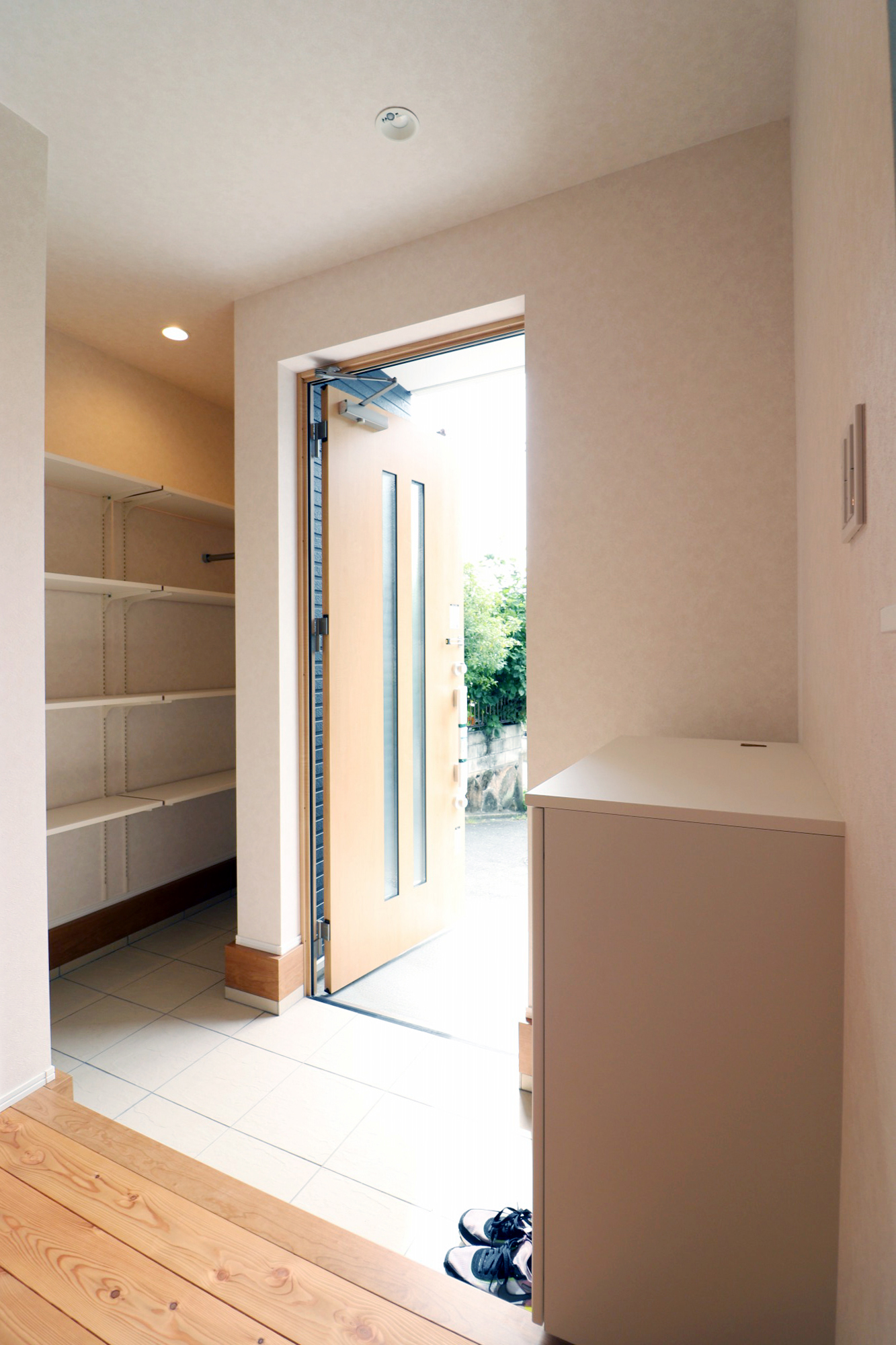 LDKを広くするため 玄関はコンパクトに。1畳の土間収納、左側にはカウンター型のコンパクトなシューズボックスは配置。