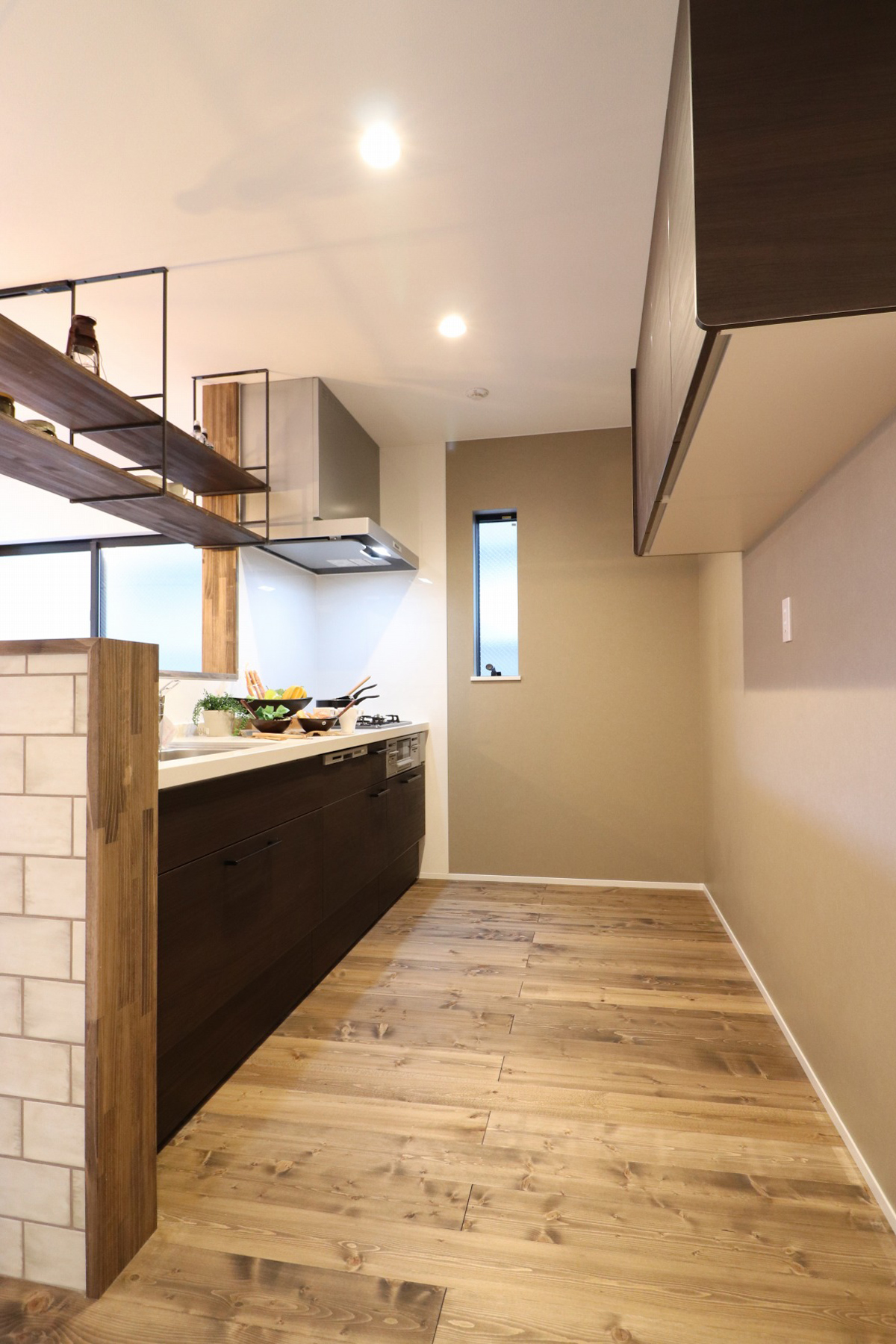 床に使ったレトロな雰囲気の無垢のフローリングは落ち着いたかっこいいベージュカラーのクロスと合わせることで、さらに渋くかっこよく。